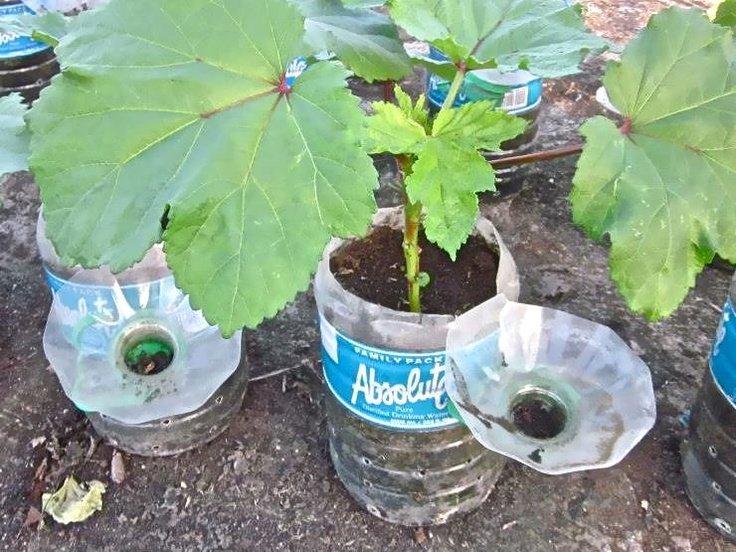 This self-watering setup ensures that okra roots receive consistent moisture without frequent watering.